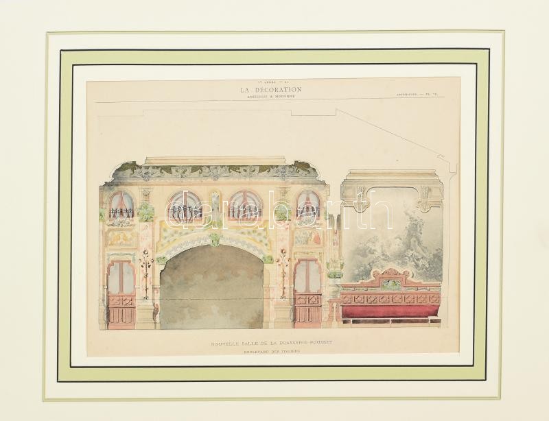 Beschreibung: cca. 1905 La Decoration,Nouvelle Salle de la Brasserie Pousset, Boulevard des Italiens, litográfia, papír, paszpartuban. 20x28cm