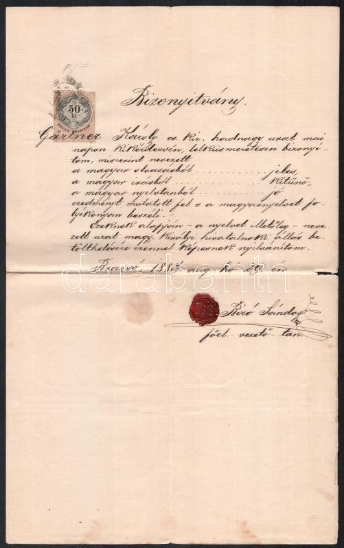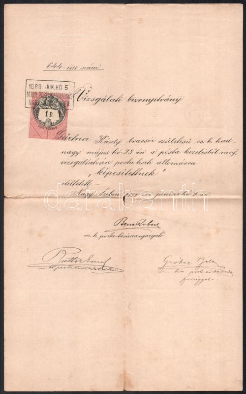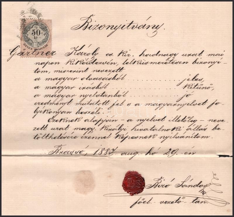 1887-1888 Brassó-Nagyszeben, hadnagy részére szóló vizsgabizonyítványok, 2 db, okmánybélyegekkel (50 kr, 1 ft), aláírásokkal, az egyiken viaszpecséttel, kis szakadásokkal.
