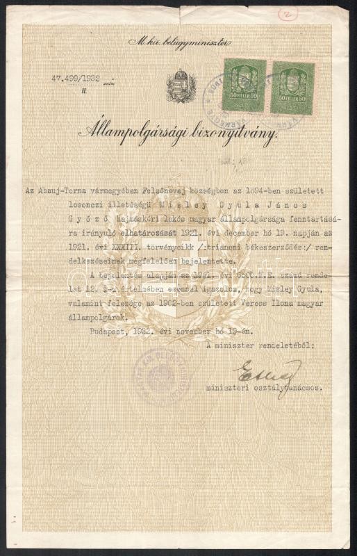 Beschreibung: 1932 Állampolgársági bizonyítvány losonci illetéségű személy részére a trianoni békeszerződés alapján bejelentve