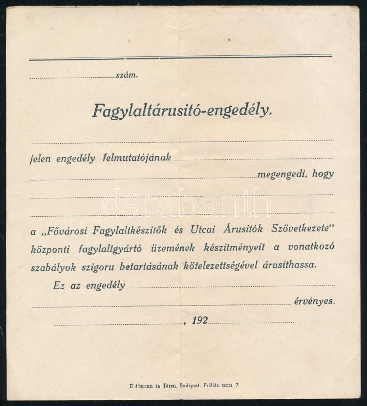 cca 1920 Fagylaltárusító engedély, Kitöltetlen nyomtatvány https://www.darabanth.com/de/416-Fernauktion/416.0/Kunst-Dokumente-andere-Sammelgebiete/Dokument~500018/cca-1920-Fagylaltarusito-engedely-Kitoltetlen-nyomtatvany~II2622721