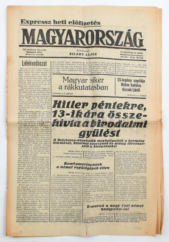 1934 A Magyarország című újság XLI. évfolyamának 154. száma, címlapon:... https://www.darabanth.com/de/416-Fernauktion/416.0/Kunst-Dokumente-andere-Sammelgebiete/Drucksachen~1000002/1934-A-Magyarorszag-cimu-ujsag-XLI-evfolyamanak-154-szama-cimlapon-Rohm-halalos-ejsz~II2619815