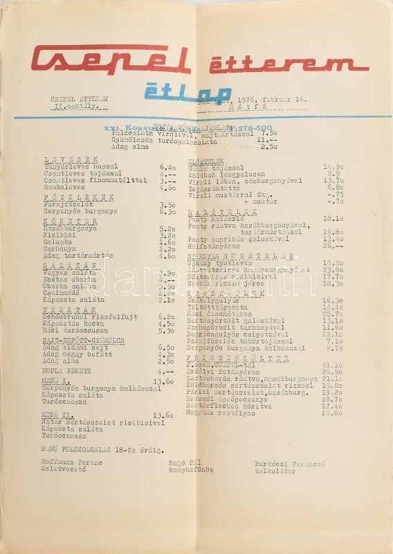 1976 Csepel étterem étlap https://www.darabanth.com/de/416-Fernauktion/416.0/Kunst-Dokumente-andere-Sammelgebiete/Drucksachen~1000002/1976-Csepel-etterem-etlap~II2617649
