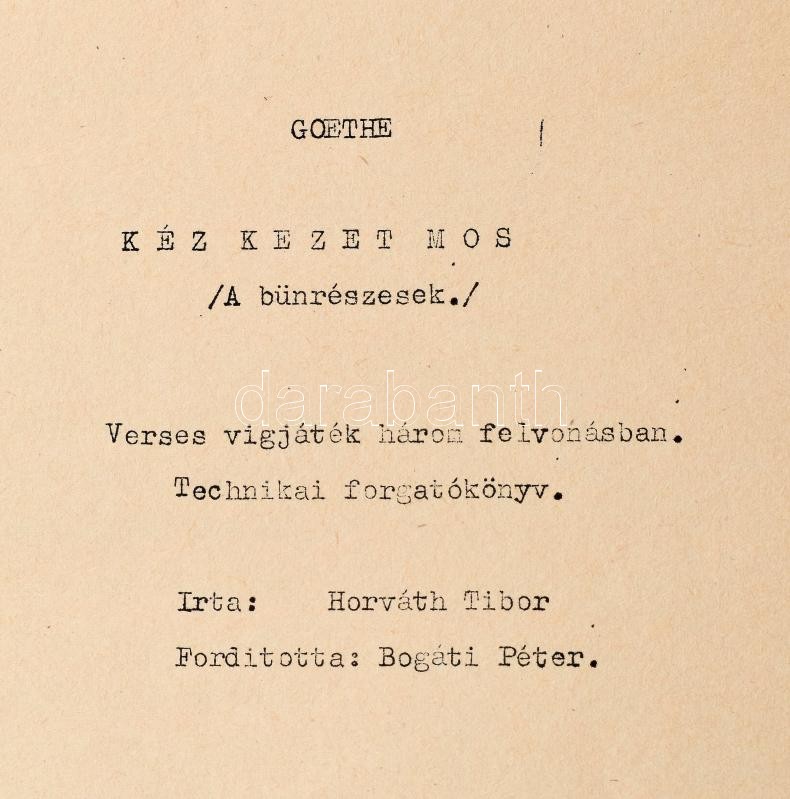 cca 1960-1970 Goethe: Kéz kezet mos (A bűnrészesek), írta: Horváth Tib... https://www.darabanth.com/de/416-Fernauktion/416.0/Kunst-Dokumente-andere-Sammelgebiete/Drucksachen~1000002/cca-1960-1970-Goethe-Kez-kezet-mos-A-bunreszesek-irta-Horvath-Tibor-Technikai-forgatoko~II2621154
