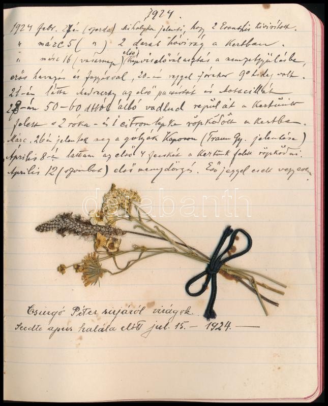 Beschreibung: 1914 Laudon István (1862-1924) ungvári tanár, botanikus kézzel írott naplórészlete néhány oldal, szárított virágokkal. Jó állapotú egészvászon kötésben