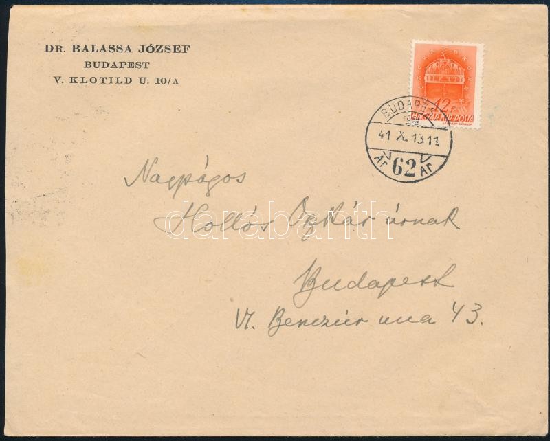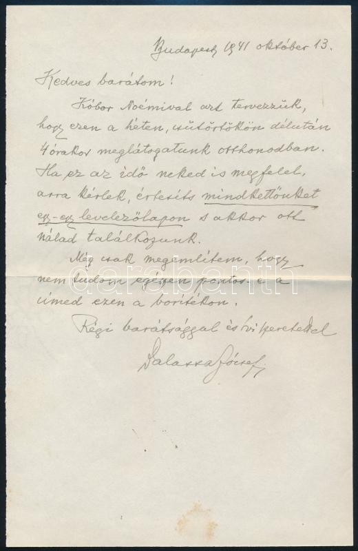 1941 Dr. Balassa József (1864-1945) tanár, nyelvész, a Szimbolikus Nagypáholy szabadkőműves társaság vezetője saját kézzel írt és aláírt levele Hollós Oszkár műgyűjtőnek, melyben közli, hogy Kóbor Noémi írónővel meglátogatják, saját borítékjában, szép állapotban