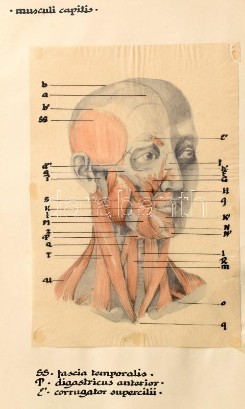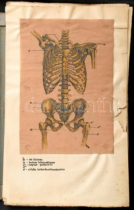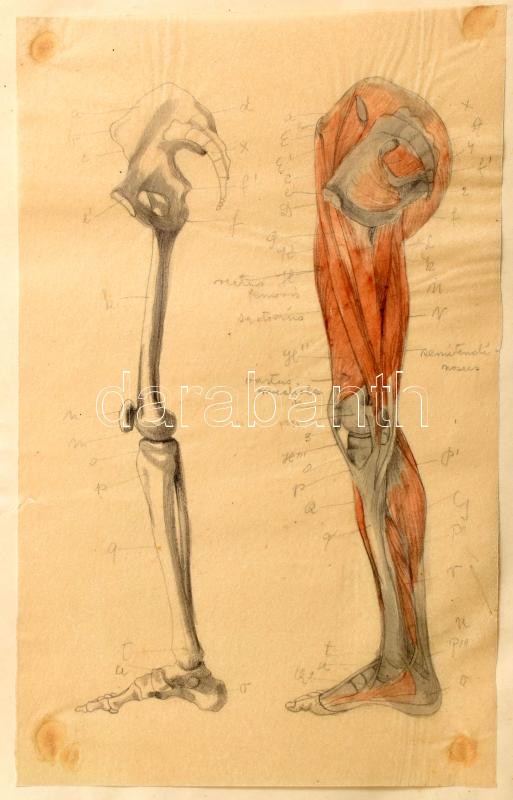 Anatómiai ábrák, rajzok gyűjteménye (emberi izomzat, csontozat felépítése), 26 sztl. lev., a lapok egy részén jegyzetekkel. Kopott, foltos félvászon mappában, a lapok jelentős része sérült (az ábrákat nem érinti).
