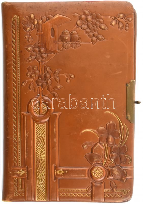 cca 1896-1903 Emlékkönyv több, részben rajzos bejegyzéssel, többségében magyar, kisebb részben magyar nyelven, szecessziós dombornyomott bőrkötésben, aranyozott lapélekkel