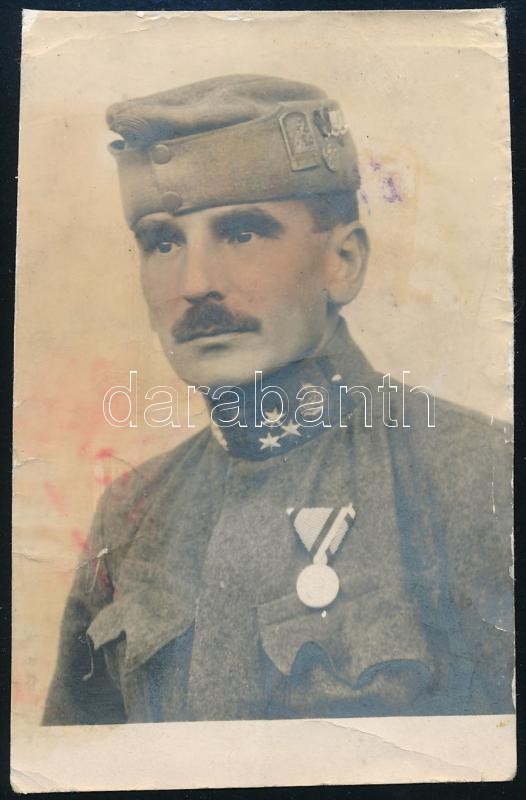 I. világháborús katona sapkajelvényekkel, kitüntetéssel, sérült, 11×7 ... https://www.darabanth.com/de/416-Fernauktion/416.0/Kunst-Dokumente-andere-Sammelgebiete/Militaria~500028/I-vilaghaborus-katona-sapkajelvenyekkel-kituntetessel-serult-11C3977-cm~II2619422
