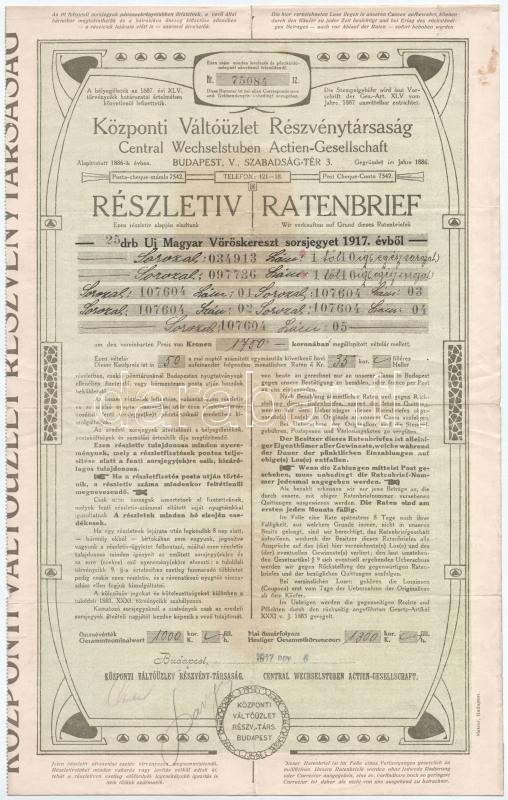 Budapest 1918. "Központi Váltóüzlet Részvénytársaság" részle... https://www.darabanth.com/de/416-Fernauktion/416.0/Numismatik/Aktien-und-Tickets~1500005/Budapest-1918-Kozponti-Valtouzlet-Reszvenytarsasag-reszletive-25-darab-1917-es-Uj-Magy~II2610047
