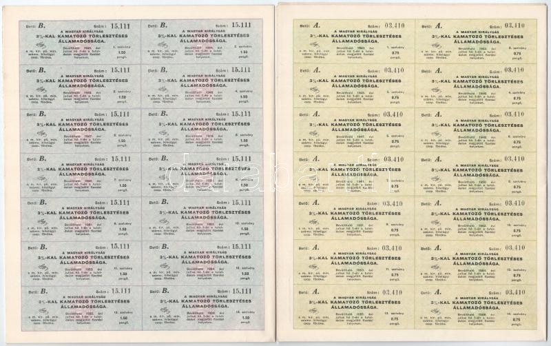 Beschreibung: Budapest 1942. "A Magyar Királyság 3%-kal Kamatozó Törlesztéses Államadóssága" kötvénye 25P-ről, 50P-ről és 100P-ről, szárazpecséttel és szelvényekkel T:II
