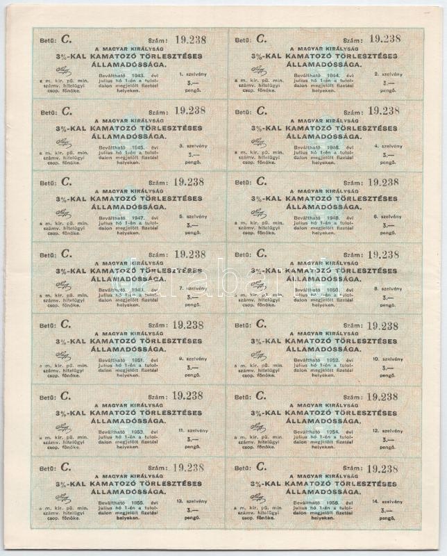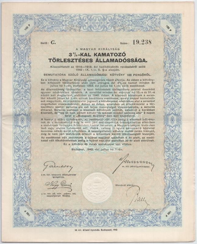 Budapest 1942. "A Magyar Királyság 3%-kal Kamatozó Törlesztéses Á... https://www.darabanth.com/de/416-Fernauktion/416.0/Numismatik/Aktien-und-Tickets~1500005/Budapest-1942-A-Magyar-Kiralysag-3-kal-Kamatozo-Torleszteses-Allamadossaga-kotvenye-25~II2618852