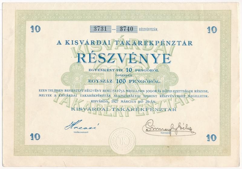 Kisvárda 1927. "A Kisvárdai Takarékpénztár" 10db részvénye e... https://www.darabanth.com/de/416-Fernauktion/416.0/Numismatik/Aktien-und-Tickets~1500005/Kisvarda-1927-A-Kisvardai-Takarekpenztar-10db-reszvenye-egyben-egyenkent-10P-rol-szelvC3~II2622622