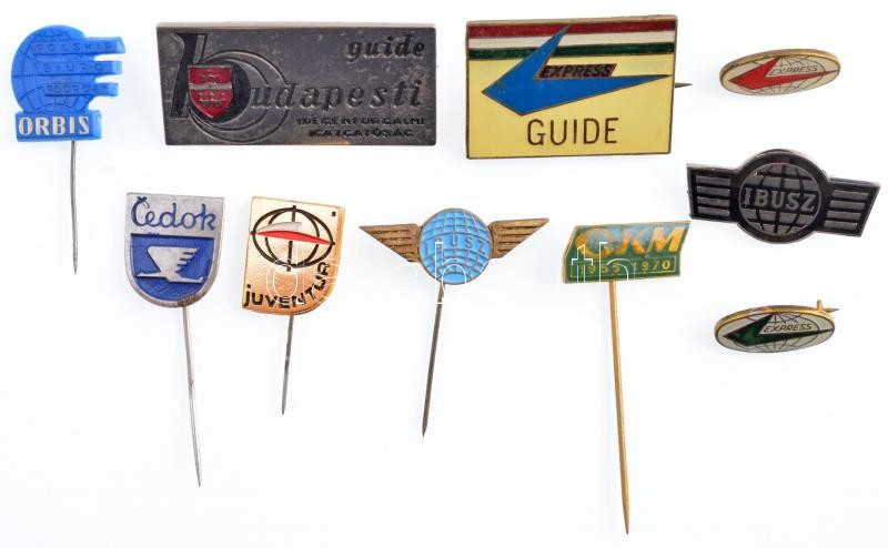 10db magyar és külföldi idegenforgalmi témájú jelvény a szocialista időszakból, közte zománcfestett és műgyantás darabok is, közte "IBUSZ", "Juventur", "Express" T:1-,2