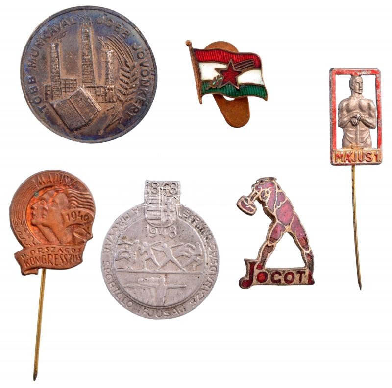 Beschreibung: 6db-os szocialista jelvény, emlékérem, tétel, közte "Több munkával jobb jövőnkért" fém jelvény (31mm), "Május 1." zománcfestett Al jelvény (22x13mm) T:2,2-