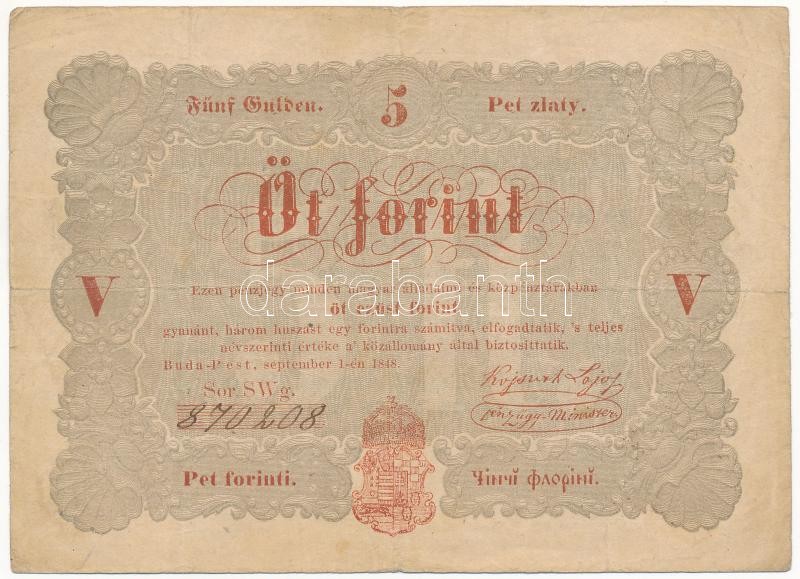 1848. 5Ft "Kossuth bankó" vörösesbarna "870208" T:... https://www.darabanth.com/de/416-Fernauktion/416.0/Numismatik/Ungarische-Banknoten~1500007/1848-5Ft-Kossuth-banko-vorosesbarna-870208-TIII-Adamo-G109~II2611629