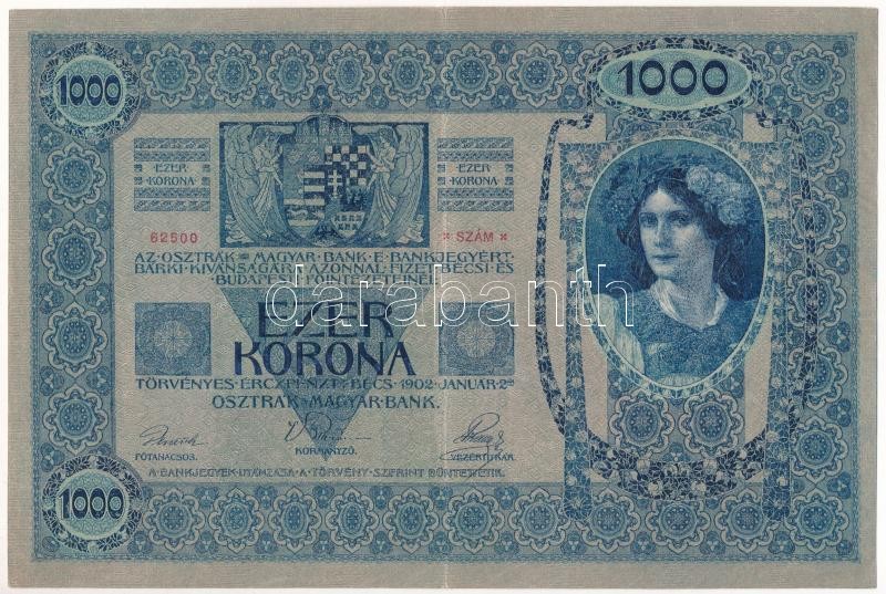 1902. 1000K felülbélyegzés nélkül T:III Adamo SK35 https://www.darabanth.com/de/416-Fernauktion/416.0/Numismatik/Ungarische-Banknoten~1500007/1902-1000K-felulbelyegzes-nelkul-TIII-Adamo-SK35~II2590259