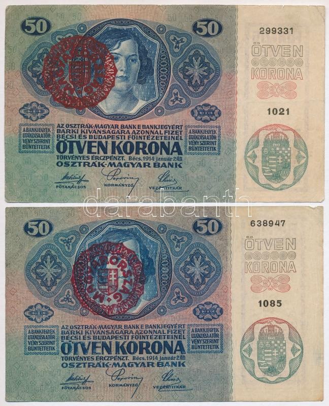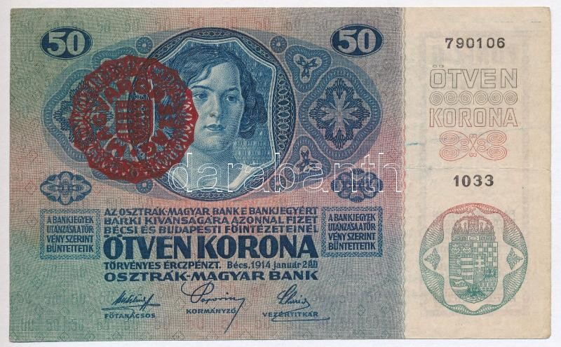 1914. 50K piros "MAGYARORSZÁG" felülbélyegzéssel (5x) T:III ... https://www.darabanth.com/de/416-Fernauktion/416.0/Numismatik/Ungarische-Banknoten~1500007/1914-50K-piros-MAGYARORSZAG-felulbelyegzessel-5x-TIII-Adamo-K24B~II2611641