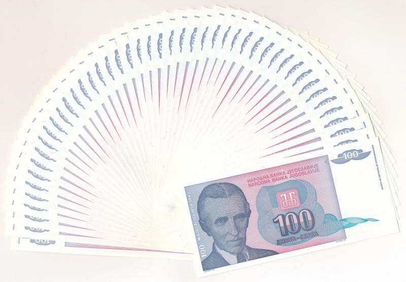Yugoslavia 1994. 100 Dinara (46x)... https://www.darabanth.com/de/416-Fernauktion/416.0/Numismatik/Weltweit-Banknoten~1500012/Jugoszlavia-1994-100D-46x-TI-I--Yugoslavia-1994-100-Dinara-46x-CUNC-AU-Krause-P23139~II2618591