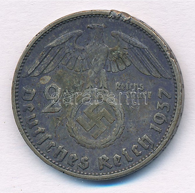 Német Harmadik Birodalom 1937A 2M Ag "Hindenburg" T:2- patina, ph German Third Reich 1937A 2 Mark Ag "Hindenburg" C:VF paina, edge error Krause KM#93