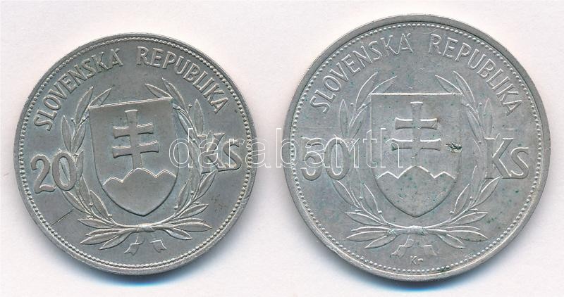 Beschreibung: Szlovákia 1939. 20K Ag "Tiso" + 1944. 50K Ag "Függetlenség 5. évfordulója" T:2- patina, ph, ü.