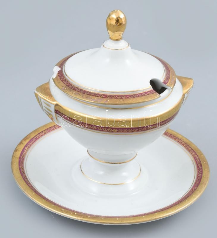 Beschreibung: Kossuch János porcelán szószos tálka fedővel. Kézzel festett, jelzett, kis kopással, a fedőn kisebb sérüléssel, d: 13 cm, m: 12,5 cm