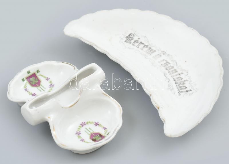 Beschreibung: Porcelán só-bors és fogvájótartó + feliratos csontos tálka. Matricás, jelzés nélkül, kopásnyomokkal, 12x8 cm, 17,5x9 cm