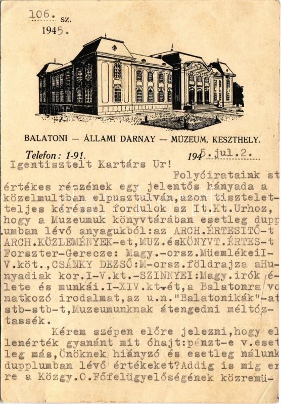 1945 Keszthely, Balatoni - Állami Darnay - Múzeum. Hátoldalon Dr. Darn... https://www.darabanth.com/de/417-Fernauktion/417.0/Ansichtskarten/Ungarn~1500004/1945-Keszthely-Balatoni-Allami-Darnay-Muzeum-Hatoldalon-Dr-Darnay-Bela-igazgato-levele-C3~II2624895