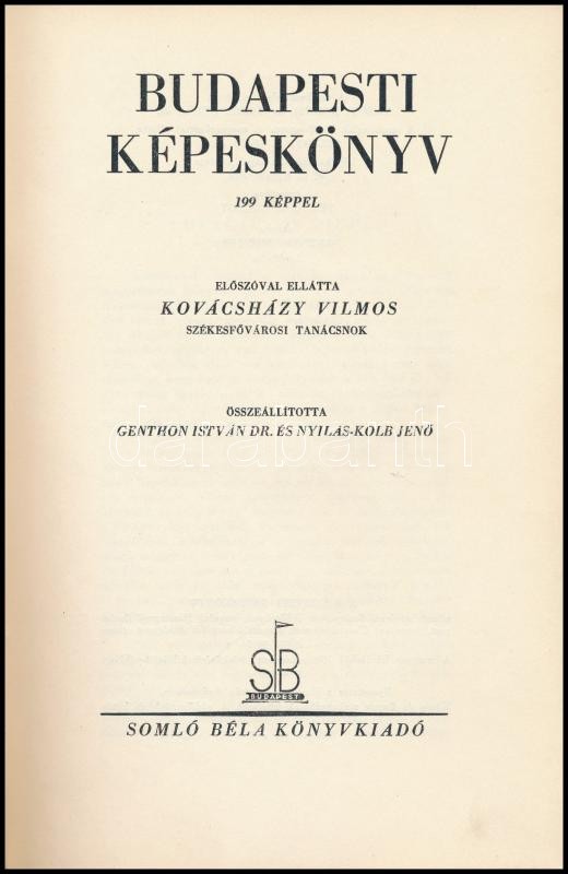 Budapesti Képeskönyv. Összeállította Genthon István és Nyilas-Kolb Jenő. Előszóval ellátta Kovácsházy Vilmos. Magyyar Tájak, magyar városok. II. kötet. Szerk.: Nyilas-Kolb Jenő. Bp., [1937], Somló Béla, 157 p. 17.-144. oldal között gazdag fekete-fehér képanyaggal. Kiadói kissé kopott aranyozott egészvászon-kötés.