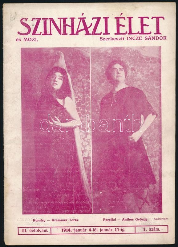 1914 Színházi élet és mozi III. évf. 1. sz., szerk.: Incze Sándor. Bp., Lengyel Lipót-ny., 32+IV p. Fekete-fehér képekkel illusztrált. Tűzött papírkötés, kissé kopott borítóval.