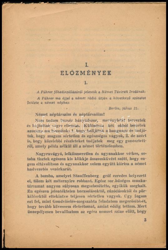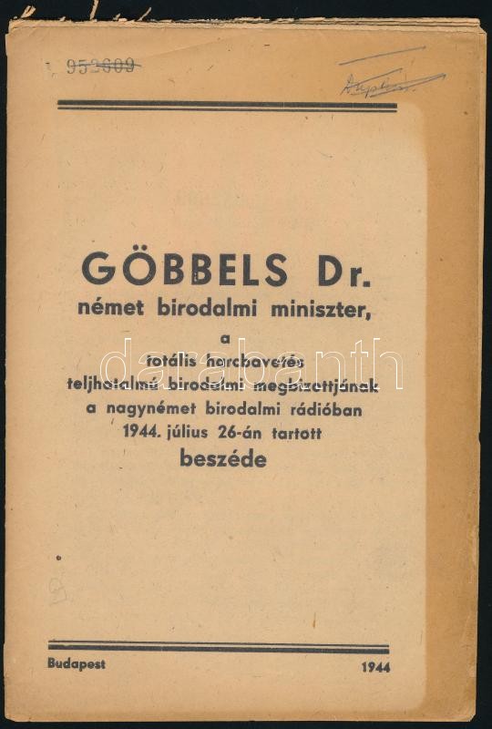 1944 Göbbels dr. német birodalmi miniszter, a totális harcbavetés teljhatalmú birodalmi megbízottjának a nagynémet birodalmi rádióban 1944. július 26-án tartott beszéde. (A Stauffenberg merénylet után) 24p. Volt könyvtári példány.