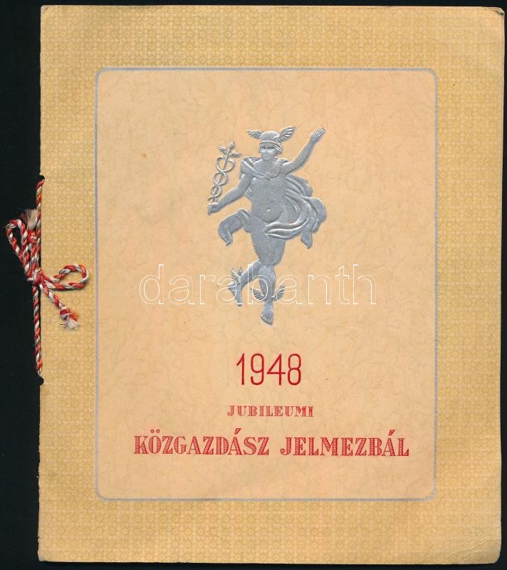 1948 Bp., Meghívó a Magyar József Nádor Műszaki és Gazdaságtudományi Egyetem Közgazdász Hallgatók Egyesülete által rendezett jubileumi álarcos közgazdász jelmezbálra, díszes zsinórfűzött papírkötésben, eredeti (sérült) fejléces borítékban