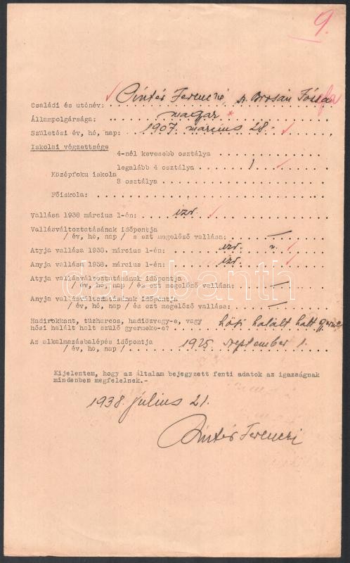 Beschreibung: 1938 Izraelita vallású személy adatlapja, kinek gyermekek hősi halált halt
