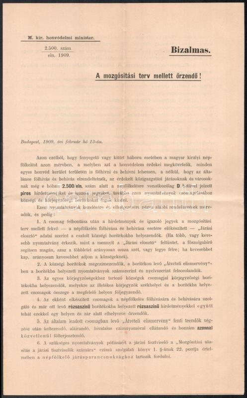 1909 Jékelfalussy honvédelmi miniszer bizalmas felhívása a honvéd kerületekhez, esetleges háború esetére foganatosítandó intézkedésekről. Behívási rend, nyomtatványok 4 p.