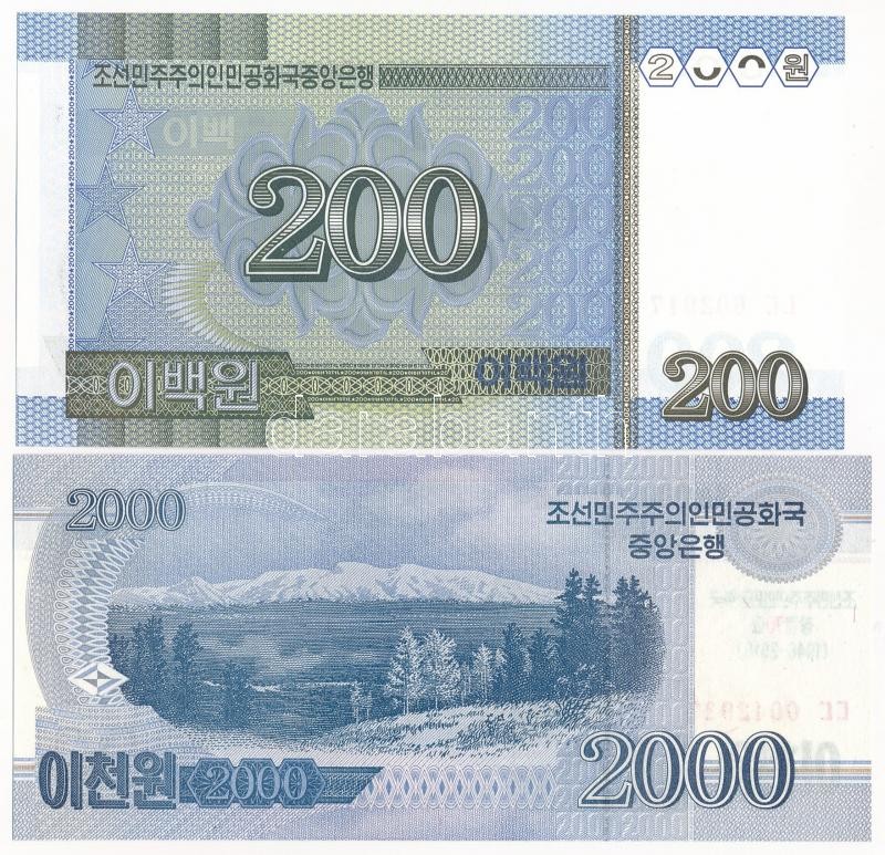 North Korea 2005. 200 Won + 2008. 2000 Won with "70th anniversary of the DPRK" overprint C:UNC