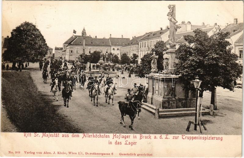 Lajtabruck, Bruck an der Leitha; Ritt Sr. Majestät aus dem Allerhöchsten Hoflager in Bruck a. d. L. zur Truppeninspizierung in das Lager / Ferenc József csapatszemlére indul a táborba. Verlag v. Alex J. Klein / Franz Joseph's ride to the troop inspection at the K.u.K. military camp (fl)