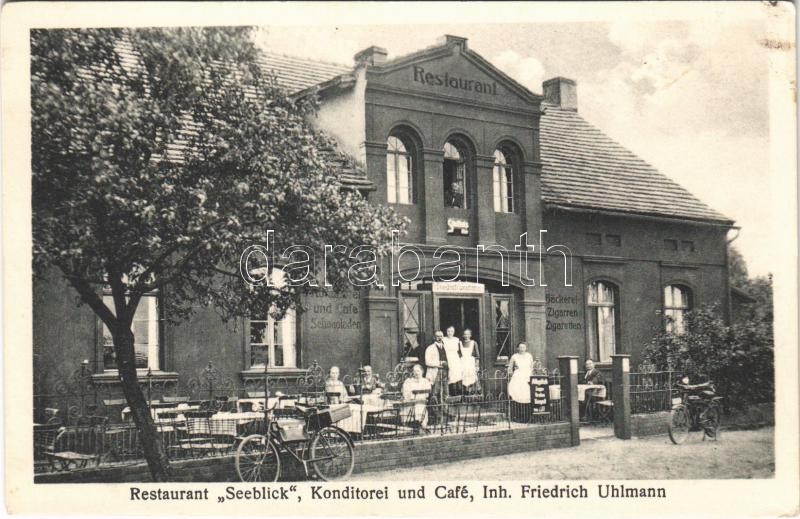 Beschreibung: Goyatz am Schwielochsee, Restaurant "Seeblick" Konditorei und Café. Inh. Friedrich Uhlmann / restaurant, confectionery and café, waitresses, bicycle