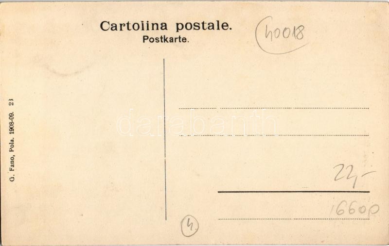 Beschreibung: SMS IBIS osztrák-magyar haditengerészet Schichau-osztályú torpedónaszádja (később SM Tb 40) / K.u.K. Kriegsmarine SM Torpedoboot Ibis / Austro-Hungarian Navy SMS IBIS Schichau-class torpedo boat (later Sm Tb 40). G. Fano, Pola, 1908-09.