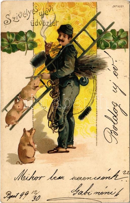 Beschreibung: 1899 (Vorläufer) Szecessziós újévi üdvözlet, kéményseprő malacokkal / Art Nouveau New Year greeting, chimney sweeper and pig. Serie 5221. litho (ázott / wet damage)