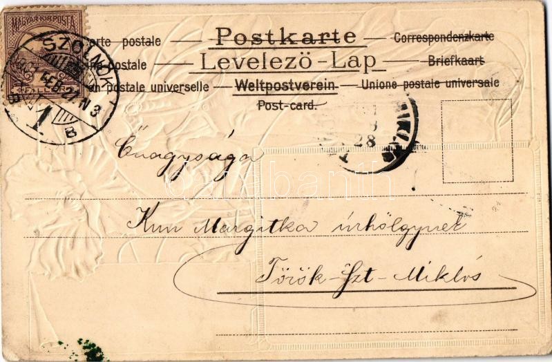 Beschreibung: 1901 Art Nouveau lady. Edgar Schmidt Serie 8072. Emb. litho (lyuk / pinhole)