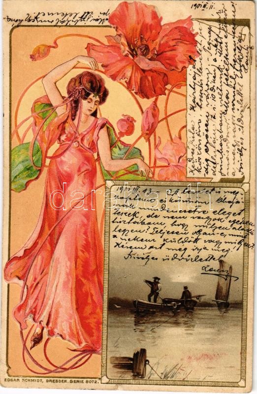 1901 Art Nouveau lady. Edgar Schmidt Serie 8072. Emb. litho (lyuk / pi... https://www.darabanth.com/de/418-Fernauktion/418.0/Ansichtskarten/Kunstlerkarten~1500040/1901-Art-Nouveau-lady-Edgar-Schmidt-Serie-8072-Emb-litho-lyuk-pinhole~II2641481