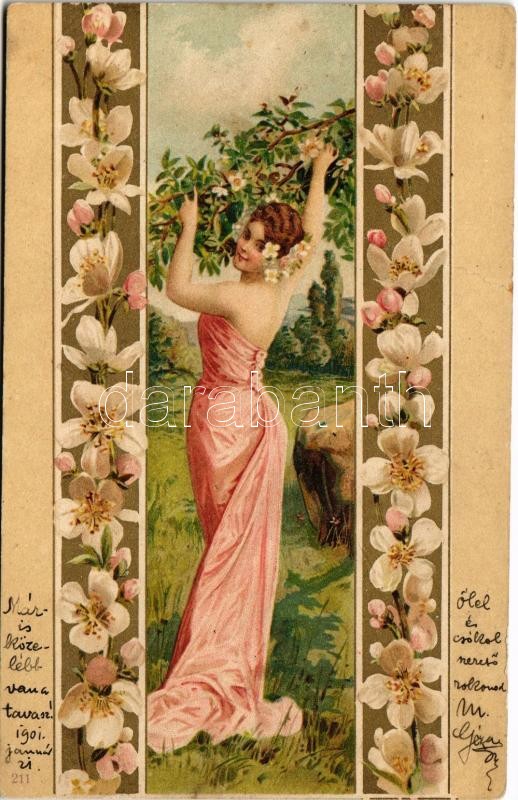 1901 Art Nouveau lady. Floral, litho (fa) https://www.darabanth.com/de/418-Fernauktion/418.0/Ansichtskarten/Kunstlerkarten~1500040/1901-Art-Nouveau-lady-Floral-litho-fa~II2641528