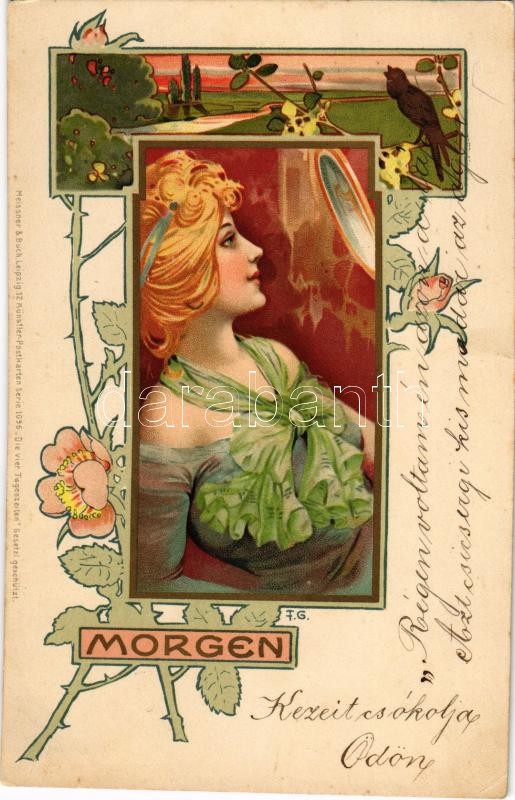 Beschreibung: 1901 Morgen. Meissner & Buch Künstler-Postkarten Serie 1096. "Die vier Tageszeiten" Art Nouveau lady, floral, litho s: F. G. (EK)