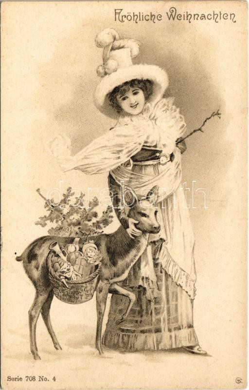 Beschreibung: Fröhliche Weihnachten / Szecessziós hölgy, karácsonyi üdvözlet / Art Nouveau lady, Christmas greeting. Serie 708. No. 4. litho