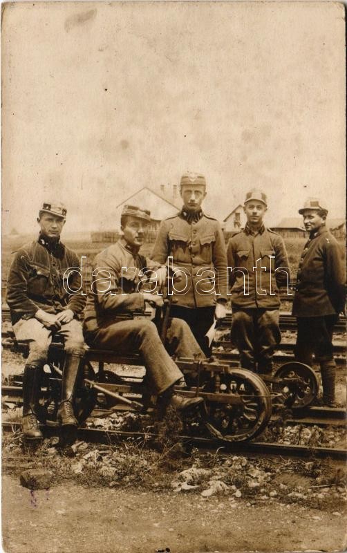 Beschreibung: 1919 C.-s. zeleznicní setnina dopravni + "CESKOSLOVENSKÁ POLNÍ POSTA 22" / Csehszlovák katonai vasutasok hajtányon / Czechoslovakian military railwaymen on draisine handcar. photo
