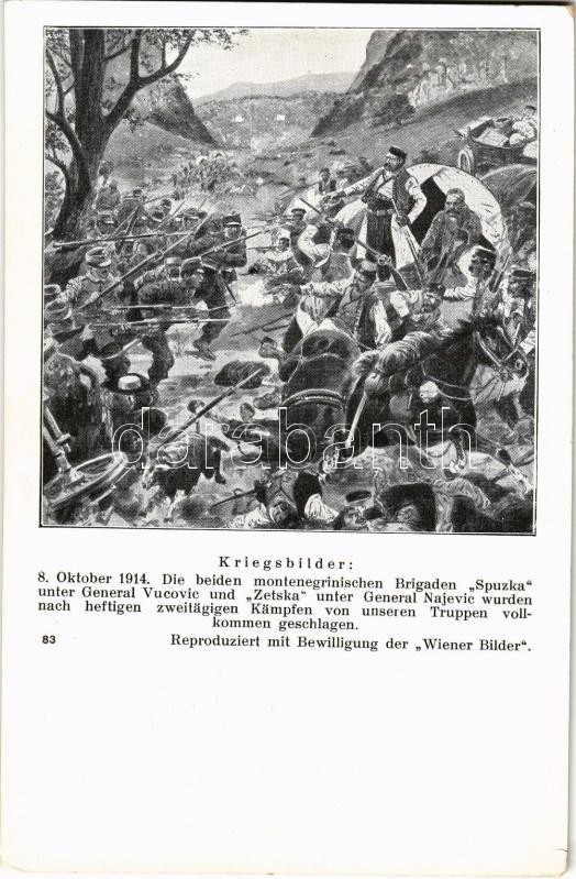 Kriegsbilder: 8. Oktober 1914. Die beiden montenegrinischen Brigaden "Spuzka" unter General Vucovic und "Zetska" unter General Najevic wurden nach heftigen zweitägigen Kämpfen von unseren Truppen vollkommen geschlagen. Wiener Rotophot / WWI Austro-Hungarian K.u.K. military art postcard (EK)