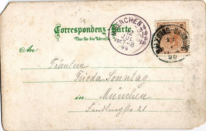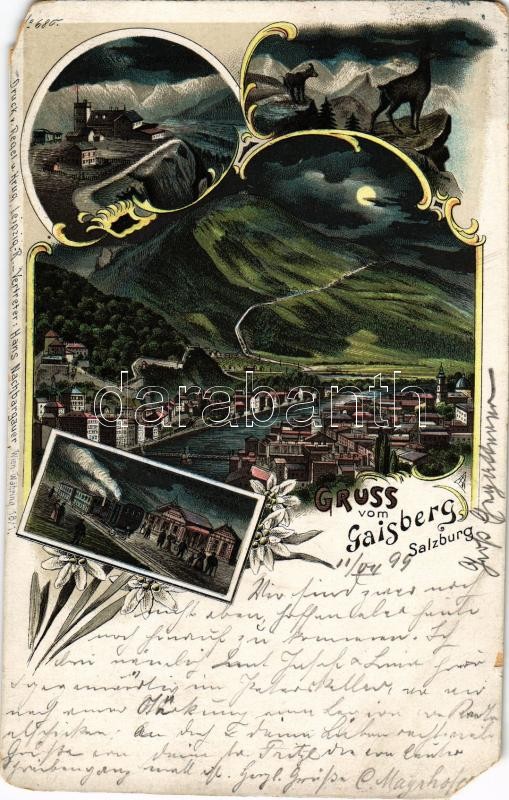Beschreibung: 1899 (Vorläufer) Salzburg, Gruss vom Gaisberg. Hotel Gaisbergspitze, Zahnradbahn-Station Zistel-Alpe / cog-wheel railway station, hotel. Art Nouveau, floral, litho (b)