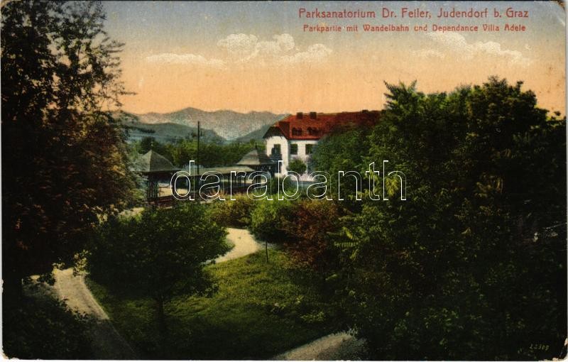 1913 Judendorf, Judendorf-Straßengel (b. Graz); Parksanatorium, Parkpartie mit Wandelbahn und Dependance Villa Adele. Verlag Dr. Feiler / hotel, cable car, park, villa (EK)