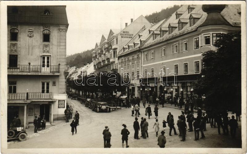Beschreibung: Mariazell (Steiermark), street view, hotel, shops, automobiles. Foto-Anstalt J. Kuss