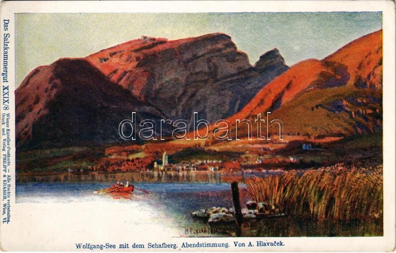 Beschreibung: Wolfgang-See mit dem Schafberg. Abendstimmung. Das Salzkammergut XXIX/8. Wiener Künstler-Postkarte Philipp & Kramer s: A. Hlavacek (EK)