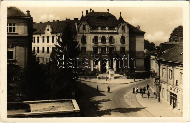 Beschreibung: 1947 Zsolna, Sillein, Zilina; Leninova ul., St. chlapc. gymnázium, Lekaren / Lenin utca, gimnázium, gyógyszertár / street view, grammar school, pharmacy (EK)